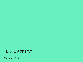 Hex #67f1be Color is a light green color and the nearest color is Medium Aquamarine #66ddaa. Hex code #67f1be and RGB value is rgb(103,241,190). In RGB color space, this color is composed of 40% red, 95% green, 75% blue, In CMYK color space, this color is composed of 57% cyan, 0% magenta, 21% yellow , 5% black , In HSL color space, this color has a hue angle of 158° , 83% saturation and 67% lightness.