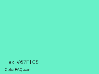 Hex #67f1c8 Color is a light green color and the nearest color is Aquamarine #7fffd4. Hex code #67f1c8 and RGB value is rgb(103,241,200). In RGB color space, this color is composed of 40% red, 95% green, 78% blue, In CMYK color space, this color is composed of 57% cyan, 0% magenta, 17% yellow , 5% black , In HSL color space, this color has a hue angle of 162° , 83% saturation and 67% lightness.