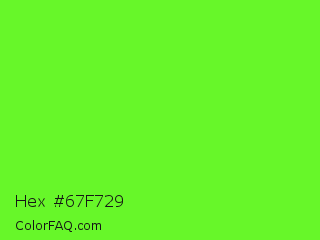 Hex #67f729 Color is a normal green color and the nearest color is Spring Frost #87ff2a. Hex code #67f729 and RGB value is rgb(103,247,41). In RGB color space, this color is composed of 40% red, 97% green, 16% blue, In CMYK color space, this color is composed of 58% cyan, 0% magenta, 83% yellow , 3% black , In HSL color space, this color has a hue angle of 102° , 93% saturation and 56% lightness.