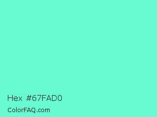 Hex #67fad0 Color is a light green color and the nearest color is Aquamarine #7fffd4. Hex code #67fad0 and RGB value is rgb(103,250,208). In RGB color space, this color is composed of 40% red, 98% green, 82% blue, In CMYK color space, this color is composed of 59% cyan, 0% magenta, 17% yellow , 2% black , In HSL color space, this color has a hue angle of 163° , 94% saturation and 69% lightness.