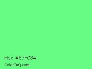 Hex #67fc84 Color is a light green color and the nearest color is Very Light Malachite Green #64e986. Hex code #67fc84 and RGB value is rgb(103,252,132). In RGB color space, this color is composed of 40% red, 99% green, 52% blue, In CMYK color space, this color is composed of 59% cyan, 0% magenta, 48% yellow , 1% black , In HSL color space, this color has a hue angle of 132° , 96% saturation and 70% lightness.