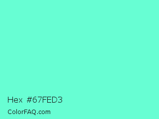 Hex #67fed3 Color is a light green color and the nearest color is Aquamarine #7fffd4. Hex code #67fed3 and RGB value is rgb(103,254,211). In RGB color space, this color is composed of 40% red, 100% green, 83% blue, In CMYK color space, this color is composed of 59% cyan, 0% magenta, 17% yellow , 0% black , In HSL color space, this color has a hue angle of 163° , 99% saturation and 70% lightness.