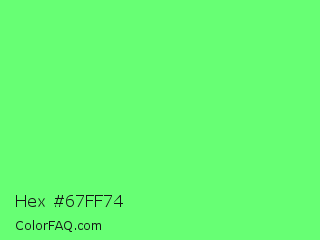 Hex #67ff74 Color is a light green color and the nearest color is Screamin Green #66ff66. Hex code #67ff74 and RGB value is rgb(103,255,116). In RGB color space, this color is composed of 40% red, 100% green, 45% blue, In CMYK color space, this color is composed of 60% cyan, 0% magenta, 55% yellow , 0% black , In HSL color space, this color has a hue angle of 125° , 100% saturation and 70% lightness.