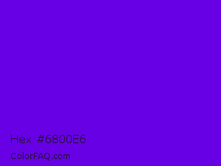 Hex #6800e6 Color is a normal violet color and the nearest color is Electric Indigo #6f00ff. Hex code #6800e6 and RGB value is rgb(104,0,230). In RGB color space, this color is composed of 41% red, 0% green, 90% blue, In CMYK color space, this color is composed of 55% cyan, 100% magenta, 0% yellow , 10% black , In HSL color space, this color has a hue angle of 267° , 100% saturation and 45% lightness.