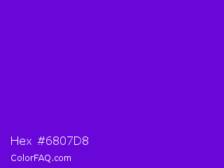 Hex #6807d8 Color is a normal violet color and the nearest color is French Violet #8806ce. Hex code #6807d8 and RGB value is rgb(104,7,216). In RGB color space, this color is composed of 41% red, 3% green, 85% blue, In CMYK color space, this color is composed of 52% cyan, 97% magenta, 0% yellow , 15% black , In HSL color space, this color has a hue angle of 268° , 94% saturation and 44% lightness.