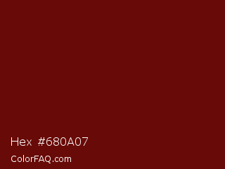 Hex #680a07 Color is a very dark red color and the nearest color is Red Oxide #6e0902. Hex code #680a07 and RGB value is rgb(104,10,7). In RGB color space, this color is composed of 41% red, 4% green, 3% blue, In CMYK color space, this color is composed of 0% cyan, 90% magenta, 93% yellow , 59% black , In HSL color space, this color has a hue angle of 2° , 87% saturation and 22% lightness.