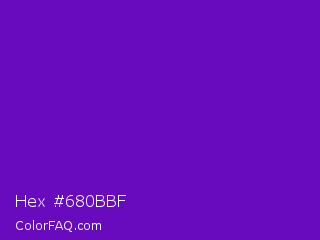 Hex #680bbf Color is a normal purple color and the nearest color is Purple Heart Crayola #652dc1. Hex code #680bbf and RGB value is rgb(104,11,191). In RGB color space, this color is composed of 41% red, 4% green, 75% blue, In CMYK color space, this color is composed of 46% cyan, 94% magenta, 0% yellow , 25% black , In HSL color space, this color has a hue angle of 271° , 89% saturation and 40% lightness.