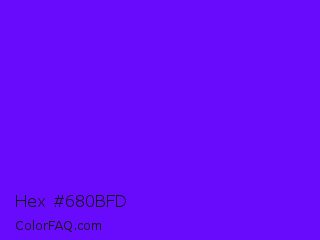 Hex #680bfd Color is a normal violet color and the nearest color is Electric Indigo #6f00ff. Hex code #680bfd and RGB value is rgb(104,11,253). In RGB color space, this color is composed of 41% red, 4% green, 99% blue, In CMYK color space, this color is composed of 59% cyan, 96% magenta, 0% yellow , 1% black , In HSL color space, this color has a hue angle of 263° , 98% saturation and 52% lightness.