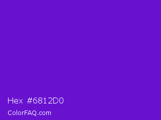 Hex #6812d0 Color is a normal violet color and the nearest color is Purple Heart Crayola #652dc1. Hex code #6812d0 and RGB value is rgb(104,18,208). In RGB color space, this color is composed of 41% red, 7% green, 82% blue, In CMYK color space, this color is composed of 50% cyan, 91% magenta, 0% yellow , 18% black , In HSL color space, this color has a hue angle of 267° , 84% saturation and 44% lightness.