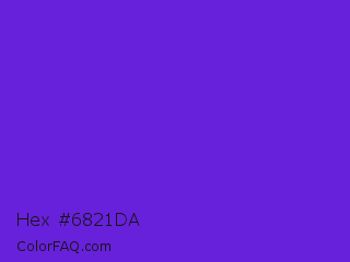 Hex #6821da Color is a normal violet color and the nearest color is Purple Heart Crayola #652dc1. Hex code #6821da and RGB value is rgb(104,33,218). In RGB color space, this color is composed of 41% red, 13% green, 85% blue, In CMYK color space, this color is composed of 52% cyan, 85% magenta, 0% yellow , 15% black , In HSL color space, this color has a hue angle of 263° , 74% saturation and 49% lightness.