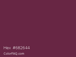 Hex #682644 Color is a dark rose color and the nearest color is Tawny Port #692545. Hex code #682644 and RGB value is rgb(104,38,68). In RGB color space, this color is composed of 41% red, 15% green, 27% blue, In CMYK color space, this color is composed of 0% cyan, 63% magenta, 35% yellow , 59% black , In HSL color space, this color has a hue angle of 333° , 46% saturation and 28% lightness.