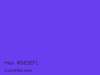 Hex #683ef1 Color is a normal indigo color and the nearest color is Majorelle Blue #6050dc. Hex code #683ef1 and RGB value is rgb(104,62,241). In RGB color space, this color is composed of 41% red, 24% green, 95% blue, In CMYK color space, this color is composed of 57% cyan, 74% magenta, 0% yellow , 5% black , In HSL color space, this color has a hue angle of 254° , 86% saturation and 59% lightness.