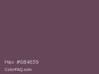 Hex #684659 Color is a normal magenta color and the nearest color is Eggplant #614051. Hex code #684659 and RGB value is rgb(104,70,89). In RGB color space, this color is composed of 41% red, 27% green, 35% blue, In CMYK color space, this color is composed of 0% cyan, 33% magenta, 14% yellow , 59% black , In HSL color space, this color has a hue angle of 326° , 20% saturation and 34% lightness.