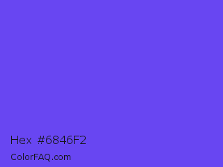 Hex #6846f2 Color is a light indigo color and the nearest color is Majorelle Blue #6050dc. Hex code #6846f2 and RGB value is rgb(104,70,242). In RGB color space, this color is composed of 41% red, 27% green, 95% blue, In CMYK color space, this color is composed of 57% cyan, 71% magenta, 0% yellow , 5% black , In HSL color space, this color has a hue angle of 252° , 87% saturation and 61% lightness.