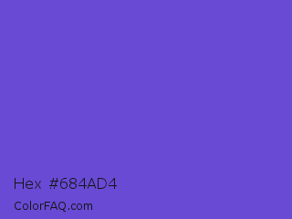Hex #684ad4 Color is a normal indigo color and the nearest color is Majorelle Blue #6050dc. Hex code #684ad4 and RGB value is rgb(104,74,212). In RGB color space, this color is composed of 41% red, 29% green, 83% blue, In CMYK color space, this color is composed of 51% cyan, 65% magenta, 0% yellow , 17% black , In HSL color space, this color has a hue angle of 253° , 62% saturation and 56% lightness.