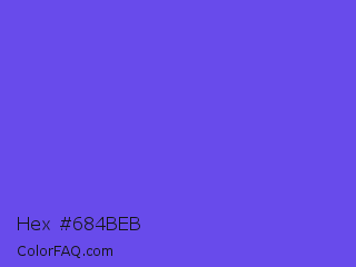Hex #684beb Color is a light indigo color and the nearest color is Majorelle Blue #6050dc. Hex code #684beb and RGB value is rgb(104,75,235). In RGB color space, this color is composed of 41% red, 29% green, 92% blue, In CMYK color space, this color is composed of 56% cyan, 68% magenta, 0% yellow , 8% black , In HSL color space, this color has a hue angle of 251° , 80% saturation and 61% lightness.