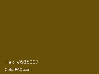 Hex #685007 Color is a very dark orange color and the nearest color is Antique Bronze #704a07. Hex code #685007 and RGB value is rgb(104,80,7). In RGB color space, this color is composed of 41% red, 31% green, 3% blue, In CMYK color space, this color is composed of 0% cyan, 23% magenta, 93% yellow , 59% black , In HSL color space, this color has a hue angle of 45° , 87% saturation and 22% lightness.