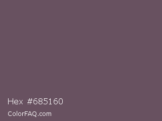 Hex #685160 Color is a normal magenta color and the nearest color is Zambezi #685558. Hex code #685160 and RGB value is rgb(104,81,96). In RGB color space, this color is composed of 41% red, 32% green, 38% blue, In CMYK color space, this color is composed of 0% cyan, 22% magenta, 8% yellow , 59% black , In HSL color space, this color has a hue angle of 321° , 12% saturation and 36% lightness.