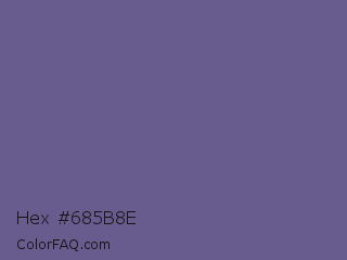 Hex #685b8e Color is a normal indigo color and the nearest color is Dark Blue Gray #666699. Hex code #685b8e and RGB value is rgb(104,91,142). In RGB color space, this color is composed of 41% red, 36% green, 56% blue, In CMYK color space, this color is composed of 27% cyan, 36% magenta, 0% yellow , 44% black , In HSL color space, this color has a hue angle of 255° , 22% saturation and 46% lightness.