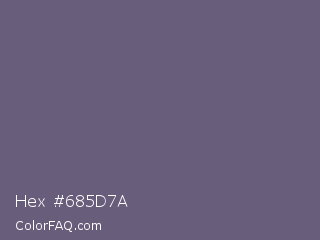 Hex #685d7a Color is a normal violet color and the nearest color is Dolphin #646077. Hex code #685d7a and RGB value is rgb(104,93,122). In RGB color space, this color is composed of 41% red, 36% green, 48% blue, In CMYK color space, this color is composed of 15% cyan, 24% magenta, 0% yellow , 52% black , In HSL color space, this color has a hue angle of 263° , 13% saturation and 42% lightness.