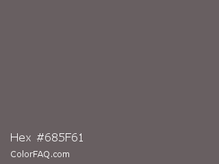 Hex #685f61 Color is a normal red color and the nearest color is Scorpion #695f62. Hex code #685f61 and RGB value is rgb(104,95,97). In RGB color space, this color is composed of 41% red, 37% green, 38% blue, In CMYK color space, this color is composed of 0% cyan, 9% magenta, 7% yellow , 59% black , In HSL color space, this color has a hue angle of 347° , 5% saturation and 39% lightness.