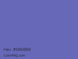 Hex #6868b8 Color is a normal blue color and the nearest color is Toolbox #746cc0. Hex code #6868b8 and RGB value is rgb(104,104,184). In RGB color space, this color is composed of 41% red, 41% green, 72% blue, In CMYK color space, this color is composed of 43% cyan, 43% magenta, 0% yellow , 28% black , In HSL color space, this color has a hue angle of 240° , 36% saturation and 56% lightness.