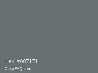 Hex #687171 Color is a normal cyan color and the nearest color is Nevada #646e75. Hex code #687171 and RGB value is rgb(104,113,113). In RGB color space, this color is composed of 41% red, 44% green, 44% blue, In CMYK color space, this color is composed of 8% cyan, 0% magenta, 0% yellow , 56% black , In HSL color space, this color has a hue angle of 180° , 4% saturation and 43% lightness.