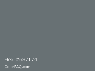 Hex #687174 Color is a normal blue color and the nearest color is Nevada #646e75. Hex code #687174 and RGB value is rgb(104,113,116). In RGB color space, this color is composed of 41% red, 44% green, 45% blue, In CMYK color space, this color is composed of 10% cyan, 3% magenta, 0% yellow , 55% black , In HSL color space, this color has a hue angle of 195° , 5% saturation and 43% lightness.