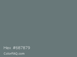 Hex #687879 Color is a normal cyan color and the nearest color is Nevada #646e75. Hex code #687879 and RGB value is rgb(104,120,121). In RGB color space, this color is composed of 41% red, 47% green, 47% blue, In CMYK color space, this color is composed of 14% cyan, 1% magenta, 0% yellow , 53% black , In HSL color space, this color has a hue angle of 184° , 8% saturation and 44% lightness.