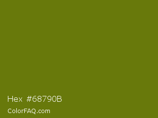 Hex #68790b Color is a dark yellow color and the nearest color is Olivetone #716e10. Hex code #68790b and RGB value is rgb(104,121,11). In RGB color space, this color is composed of 41% red, 47% green, 4% blue, In CMYK color space, this color is composed of 14% cyan, 0% magenta, 91% yellow , 53% black , In HSL color space, this color has a hue angle of 69° , 83% saturation and 26% lightness.