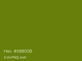 Hex #68800b Color is a dark lime color and the nearest color is Avocado #568203. Hex code #68800b and RGB value is rgb(104,128,11). In RGB color space, this color is composed of 41% red, 50% green, 4% blue, In CMYK color space, this color is composed of 19% cyan, 0% magenta, 91% yellow , 50% black , In HSL color space, this color has a hue angle of 72° , 84% saturation and 27% lightness.