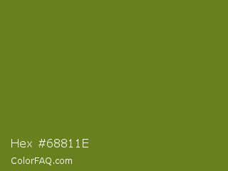 Hex #68811e Color is a normal lime color and the nearest color is Olive Drab #6b8e23. Hex code #68811e and RGB value is rgb(104,129,30). In RGB color space, this color is composed of 41% red, 51% green, 12% blue, In CMYK color space, this color is composed of 19% cyan, 0% magenta, 77% yellow , 49% black , In HSL color space, this color has a hue angle of 75° , 62% saturation and 31% lightness.