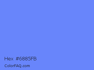 Hex #6885fb Color is a light blue color and the nearest color is Cornflower Blue #6495ed. Hex code #6885fb and RGB value is rgb(104,133,251). In RGB color space, this color is composed of 41% red, 52% green, 98% blue, In CMYK color space, this color is composed of 59% cyan, 47% magenta, 0% yellow , 2% black , In HSL color space, this color has a hue angle of 228° , 95% saturation and 70% lightness.