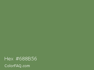Hex #688b56 Color is a normal green color and the nearest color is Glade Green #61845f. Hex code #688b56 and RGB value is rgb(104,139,86). In RGB color space, this color is composed of 41% red, 55% green, 34% blue, In CMYK color space, this color is composed of 25% cyan, 0% magenta, 38% yellow , 45% black , In HSL color space, this color has a hue angle of 100° , 24% saturation and 44% lightness.