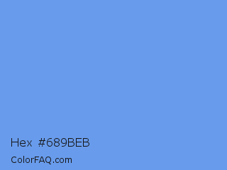 Hex #689beb Color is a light blue color and the nearest color is Cornflower Blue #6495ed. Hex code #689beb and RGB value is rgb(104,155,235). In RGB color space, this color is composed of 41% red, 61% green, 92% blue, In CMYK color space, this color is composed of 56% cyan, 34% magenta, 0% yellow , 8% black , In HSL color space, this color has a hue angle of 217° , 77% saturation and 66% lightness.