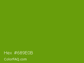 Hex #689e0b Color is a normal green color and the nearest color is Christi #67a712. Hex code #689e0b and RGB value is rgb(104,158,11). In RGB color space, this color is composed of 41% red, 62% green, 4% blue, In CMYK color space, this color is composed of 34% cyan, 0% magenta, 93% yellow , 38% black , In HSL color space, this color has a hue angle of 82° , 87% saturation and 33% lightness.