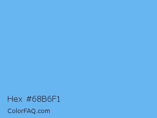 Hex #68b6f1 Color is a light blue color and the nearest color is Blue Jeans #5dadec. Hex code #68b6f1 and RGB value is rgb(104,182,241). In RGB color space, this color is composed of 41% red, 71% green, 95% blue, In CMYK color space, this color is composed of 57% cyan, 24% magenta, 0% yellow , 5% black , In HSL color space, this color has a hue angle of 206° , 83% saturation and 68% lightness.