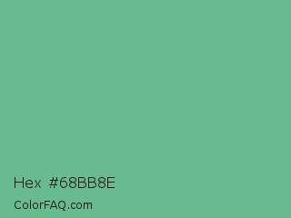 Hex #68bb8e Color is a normal green color and the nearest color is Silver Tree #66b58f. Hex code #68bb8e and RGB value is rgb(104,187,142). In RGB color space, this color is composed of 41% red, 73% green, 56% blue, In CMYK color space, this color is composed of 44% cyan, 0% magenta, 24% yellow , 27% black , In HSL color space, this color has a hue angle of 147° , 38% saturation and 57% lightness.