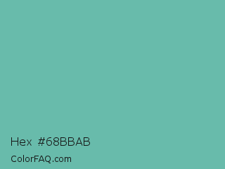 Hex #68bbab Color is a normal cyan color and the nearest color is Tradewind #5fb3ac. Hex code #68bbab and RGB value is rgb(104,187,171). In RGB color space, this color is composed of 41% red, 73% green, 67% blue, In CMYK color space, this color is composed of 44% cyan, 0% magenta, 9% yellow , 27% black , In HSL color space, this color has a hue angle of 168° , 38% saturation and 57% lightness.