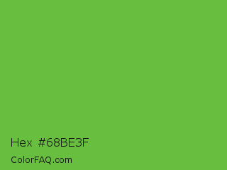 Hex #68be3f Color is a normal green color and the nearest color is Green RYB #66b032. Hex code #68be3f and RGB value is rgb(104,190,63). In RGB color space, this color is composed of 41% red, 75% green, 25% blue, In CMYK color space, this color is composed of 45% cyan, 0% magenta, 67% yellow , 25% black , In HSL color space, this color has a hue angle of 101° , 50% saturation and 50% lightness.