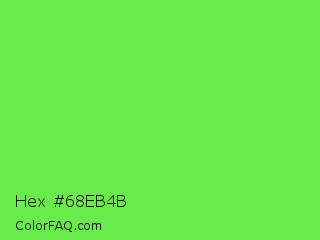 Hex #68eb4b Color is a light green color and the nearest color is Screamin Green #66ff66. Hex code #68eb4b and RGB value is rgb(104,235,75). In RGB color space, this color is composed of 41% red, 92% green, 29% blue, In CMYK color space, this color is composed of 56% cyan, 0% magenta, 68% yellow , 8% black , In HSL color space, this color has a hue angle of 109° , 80% saturation and 61% lightness.