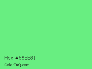 Hex #68ee81 Color is a light green color and the nearest color is Very Light Malachite Green #64e986. Hex code #68ee81 and RGB value is rgb(104,238,129). In RGB color space, this color is composed of 41% red, 93% green, 51% blue, In CMYK color space, this color is composed of 56% cyan, 0% magenta, 46% yellow , 7% black , In HSL color space, this color has a hue angle of 131° , 80% saturation and 67% lightness.