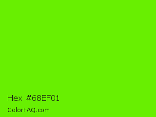 Hex #68ef01 Color is a normal green color and the nearest color is Bright Green #66ff00. Hex code #68ef01 and RGB value is rgb(104,239,1). In RGB color space, this color is composed of 41% red, 94% green, 0% blue, In CMYK color space, this color is composed of 56% cyan, 0% magenta, 100% yellow , 6% black , In HSL color space, this color has a hue angle of 94° , 99% saturation and 47% lightness.