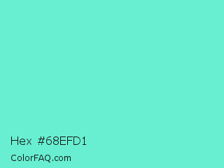 Hex #68efd1 Color is a light cyan color and the nearest color is Aquamarine #7fffd4. Hex code #68efd1 and RGB value is rgb(104,239,209). In RGB color space, this color is composed of 41% red, 94% green, 82% blue, In CMYK color space, this color is composed of 56% cyan, 0% magenta, 13% yellow , 6% black , In HSL color space, this color has a hue angle of 167° , 81% saturation and 67% lightness.