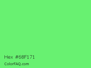 Hex #68f171 Color is a light green color and the nearest color is Screamin Green #66ff66. Hex code #68f171 and RGB value is rgb(104,241,113). In RGB color space, this color is composed of 41% red, 95% green, 44% blue, In CMYK color space, this color is composed of 57% cyan, 0% magenta, 53% yellow , 5% black , In HSL color space, this color has a hue angle of 124° , 83% saturation and 68% lightness.