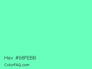 Hex #68febb Color is a light green color and the nearest color is Aquamarine #7fffd4. Hex code #68febb and RGB value is rgb(104,254,187). In RGB color space, this color is composed of 41% red, 100% green, 73% blue, In CMYK color space, this color is composed of 59% cyan, 0% magenta, 26% yellow , 0% black , In HSL color space, this color has a hue angle of 153° , 99% saturation and 70% lightness.