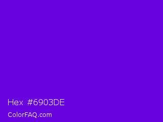 Hex #6903de Color is a normal violet color and the nearest color is Electric Indigo #6f00ff. Hex code #6903de and RGB value is rgb(105,3,222). In RGB color space, this color is composed of 41% red, 1% green, 87% blue, In CMYK color space, this color is composed of 53% cyan, 99% magenta, 0% yellow , 13% black , In HSL color space, this color has a hue angle of 268° , 97% saturation and 44% lightness.