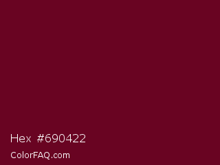 Hex #690422 Color is a very dark rose color and the nearest color is Black Rose #67032d. Hex code #690422 and RGB value is rgb(105,4,34). In RGB color space, this color is composed of 41% red, 2% green, 13% blue, In CMYK color space, this color is composed of 0% cyan, 96% magenta, 68% yellow , 59% black , In HSL color space, this color has a hue angle of 342° , 93% saturation and 21% lightness.