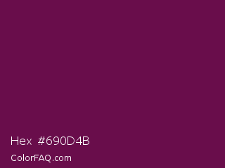 Hex #690d4b Color is a dark magenta color and the nearest color is Pompadour #660045. Hex code #690d4b and RGB value is rgb(105,13,75). In RGB color space, this color is composed of 41% red, 5% green, 29% blue, In CMYK color space, this color is composed of 0% cyan, 88% magenta, 29% yellow , 59% black , In HSL color space, this color has a hue angle of 320° , 78% saturation and 23% lightness.