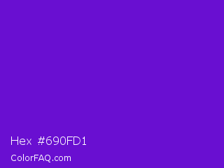 Hex #690fd1 Color is a normal violet color and the nearest color is French Violet #8806ce. Hex code #690fd1 and RGB value is rgb(105,15,209). In RGB color space, this color is composed of 41% red, 6% green, 82% blue, In CMYK color space, this color is composed of 50% cyan, 93% magenta, 0% yellow , 18% black , In HSL color space, this color has a hue angle of 268° , 87% saturation and 44% lightness.